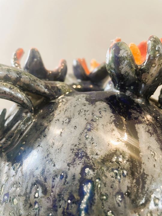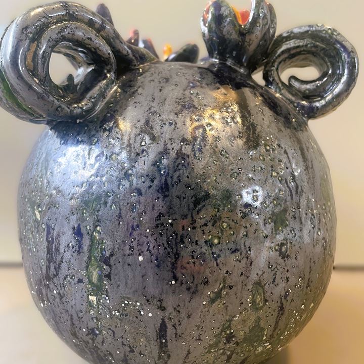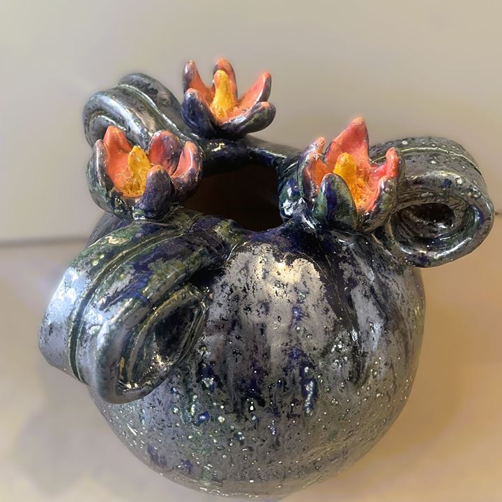 Deze handgemaakte bloemenvaas is allesbehalve gewoon. Met zijn speelse krullen en diepe glanzende kleuren is het een echte blikvanger in huis.
