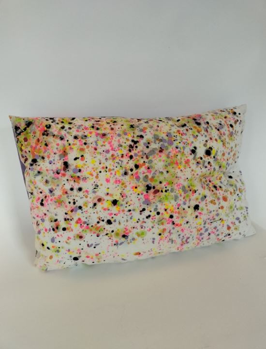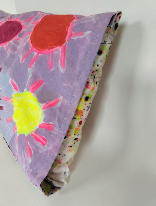 Dit kussen genaamd Spetterende Zomer heeft Marjan gemaakt met textielverf. In dit kussen zit een binnen kussen. De kussenhoes is wasbaar in de wasmachine op 40 graden.