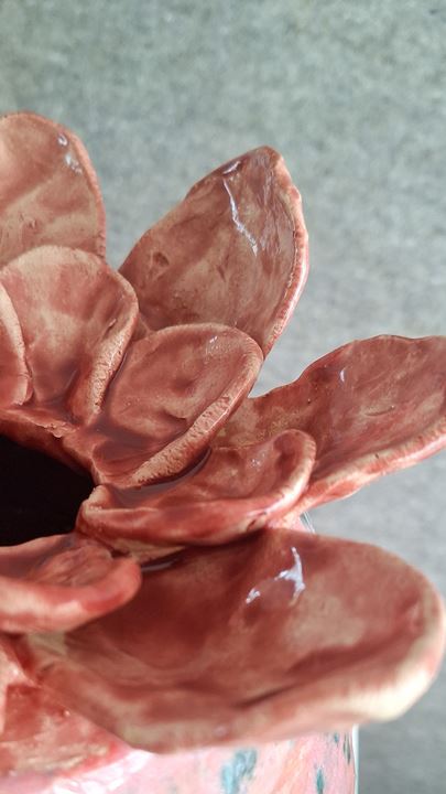 De zonroos is een vaas die meteen opvalt door haar open bloemblaadjes en warme roze tinten. De speelse spikkels op de bol geven het gevoel alsof er zonlicht doorheen danst. Het is een vrolijk en vriendelijk stuk dat moeiteloos sfeer toevoegt aan elke plek waar je haar neerzet.